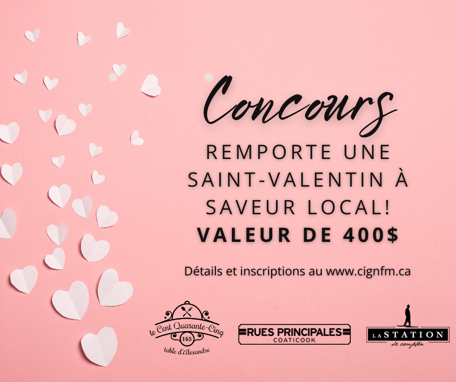 TERMINÉ! Félicitations à Loïc Ouimette. Une St-Valentin à saveur local cette année? CIGN fm en collaboration avec Rues Principales, le [...]