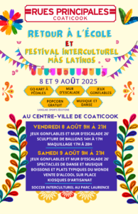 Le samedi 9 août, c’est au tour du Festival interculturel Mas Latinos de s’installer au centre-ville, une première depuis son déménagement depuis le parc Laurence. Il s’agit de la troisième édition de l’événement, mais de la première organisée en collaboration avec Rues Principales. L’événement a lieu beau temps, mauvais temps — et la météo s’annonce favorable pour l’instant explique Julie Favreau, directrice de l’organisme Rues Principales: