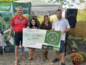 Pour une deuxième année de suite, l’événement Mobilisation Petits Bedons a été couronné de succès, en fin de semaine dernière, au parc de la Gorge de Coaticook. L’événement a effectivement permis d’amasser la coquette somme de 15 650 $, laquelle sera versée à des écoles primaires de Coaticook pour les appuyer dans leur programme d’aide alimentaire. L’activité s’est tenue lors des journées de samedi, dimanche et lundi. Pour chaque entrée payante à la Gorge, un montant de 1.00 $ était retenu pour cette campagne. Un donateur anonyme a aussi versé une somme non négligeable. La remise du chèque s’est faite, hier soir, à l’occasion d’un pique-nique à la grange ronde du parc de la Gorge en présence du président, Jean-Yves Caron, de la directrice du parc, Caroline Sage, de l’instigatrice de l’événement, Carole-Anne Tremblay et du directeur de l’école Sacré-Coeur, Francis Larochelle.