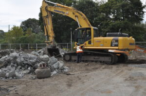 La démolition de la piscine municipale de Coaticook s’est amorcée au cours des derniers jours. À en juger par cette photo, il ne reste que des vestiges de cette piscine construite en 1964.  Tout le  béton formant la piscine et le contour de celle-ci a été démolie. Un vrai chantier de guerre. Les opérations de démolition vont se poursuivre au cours des prochains jours et d’ici quelques semaines, on devrait avoir une bonne idée de ce que la nouvelle piscine aura l’air.  C’est une page d’histoire qui se tourne sur cette infrastructure en loisir très fréquenté dans les années 1960 et 1970. Une piscine avec trois tremplins de 1 mètre et 3 mètres.