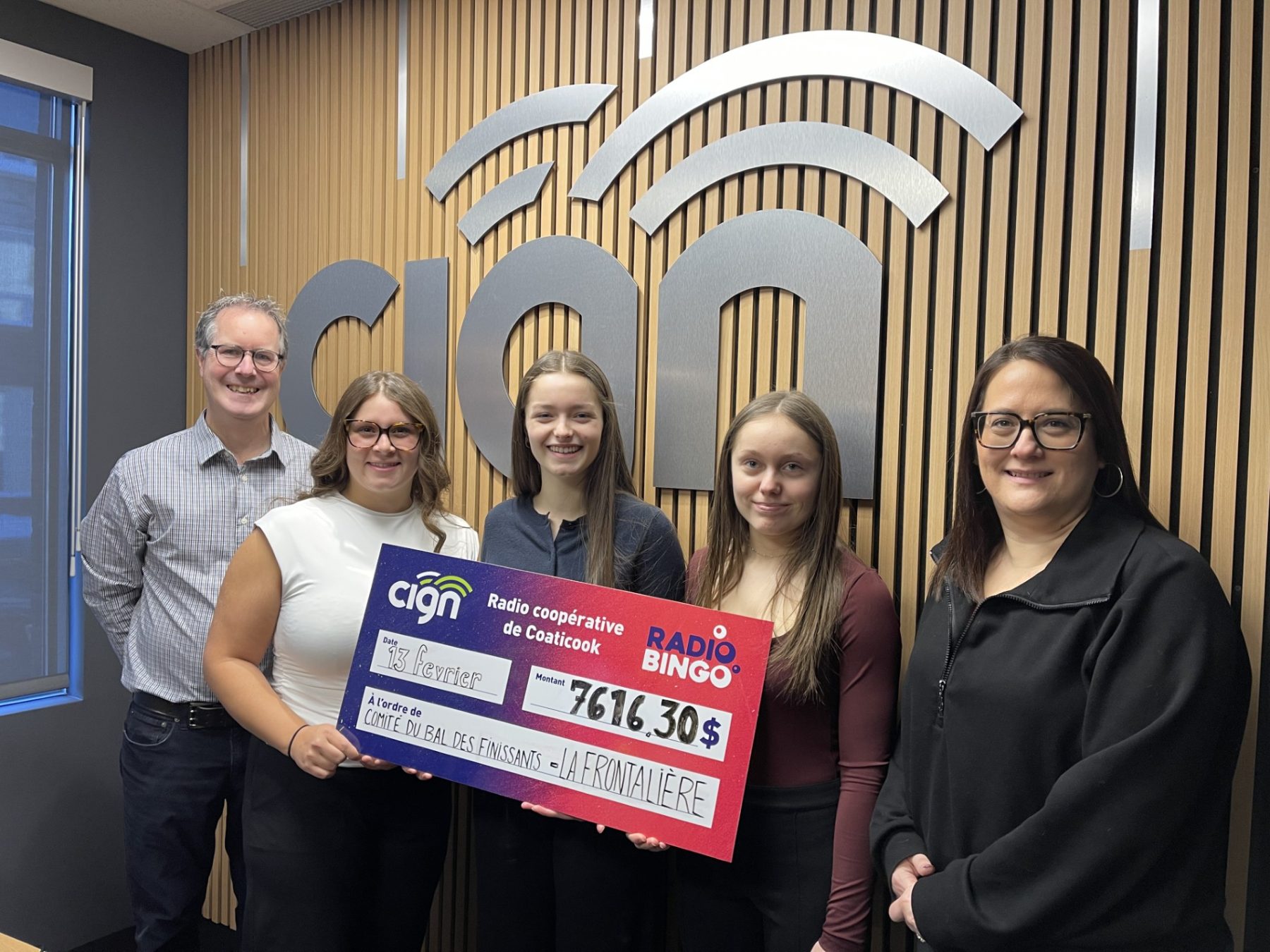 Ce matin, le 13 février 2026, trois jeunes étudiantes de l’école secondaire La Frontalière se sont présentées à la radio CIGN FM, tout sourire, pour recevoir un chèque de 7 616,30 $ destiné au comité du bal des finissants de leur école.