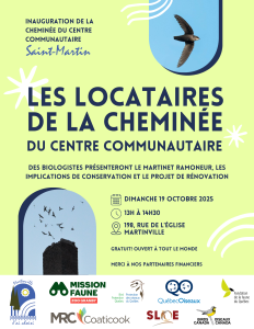 Pour souligner le retour du martinet ramoneur à Martinville et pour sensibiliser le public à l’importance de préserver l’habitat de cet espèce, un événement public gratuit aura lieu le dimanche 19 octobre 2025, de 13 h à 14 h 30, au Centre communautaire Saint-Martin, situé au 198, rue de l’Église, à Martinville.