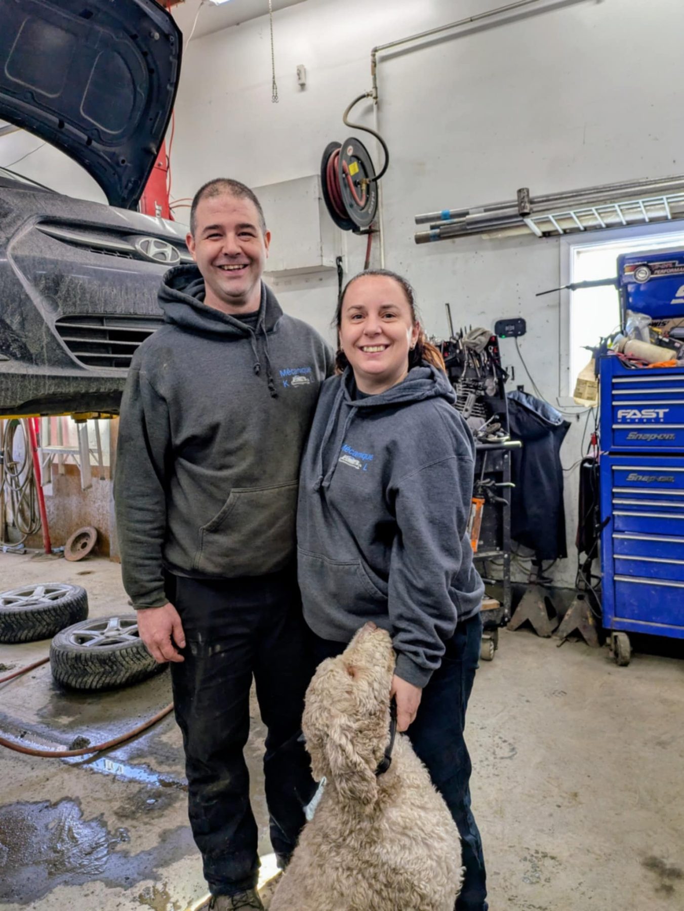 Sur la photo : M. Karl Lanctôt et Mme Maryse Blanchette, corpropriétaires de l’entreprise Mécanique KL accompagnés de leur acolyte Chewy (chien)
