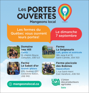Quatre fermes de l’Estrie vous ouvriront leurs portes, dont deux dans notre MRC, soit le domaine Ives Hill à Compton et la ferme Piscicole des Bobines à East-Hereford. Cliquez ici pour plus d’infos.