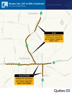 Ces interventions font partie d’un projet de réfection routière de 2 millions de dollars financé par le gouvernement du Québec. Les travaux, qui débuteront officiellement le lundi 21 juillet, s’échelonneront sur environ neuf semaines (jusqu’à septembre). Le ministère des Transports a précisé les secteurs concernés : la route 141, entre les rues Roger-Smith et des Nénuphars ; la route 206, entre les rues Saint-Jacques et du Cardinal ; ainsi que la route 147, de la route 141 jusqu’à la limite municipale de Compton.
