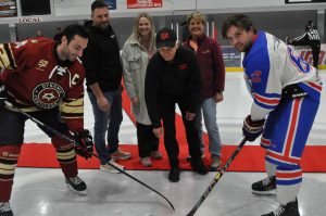 Le Dynamik de Coaticook a réussi sa rentrée, vendredi, au Centre Gérard-Couillard en signant une victoire de 6-2 sur les Nordiks Blades de Val-des-Sources. Maël Plante a dirigé l’attaque avec une paire de but. Les Coaticookois montrent actuellement un dossier de 1 victoire et 1 défaite et disputera son prochain match, vendredi (10 octobre), contre le JDL de Davelyuville, les champions défendants de la ligue senior en 2024 et 2025. Ci-haut, la photo de la mise au jeu officielle qui a précédé le match de vendredi soir dernier. On aperçoit Gilles Lafaille des Services agricoles qui dépose la rondelle.